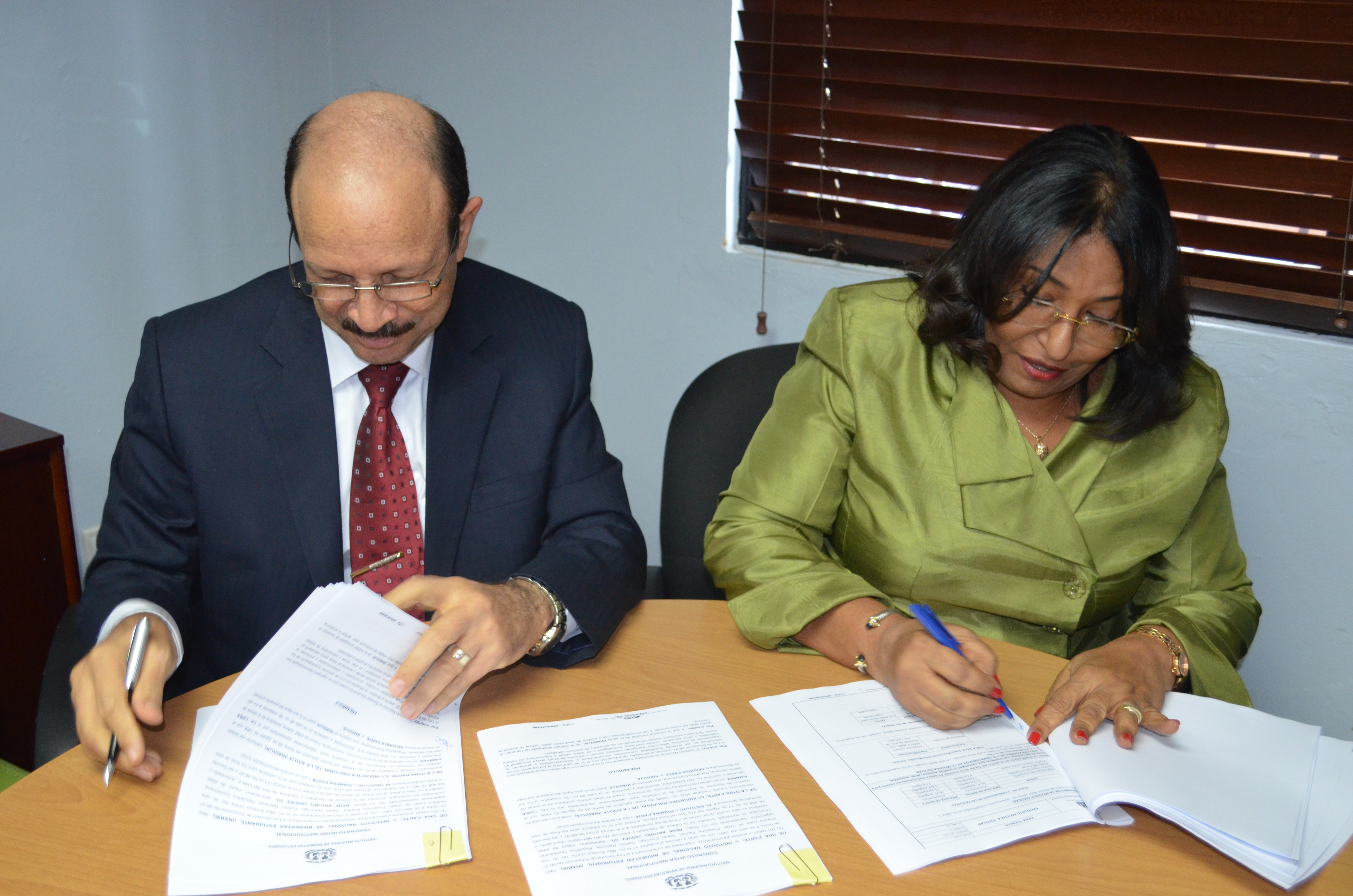 El director del Inabie, René Jáquez Gil y la directora ejecutiva de Inaguja, Luisa Ramírez, mientras firman acuerdo interinstitucional.