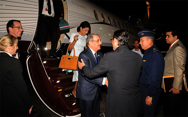 Medina regresó en vuelo privado por la Base Aérea de San Isidro, acompañado de la Primera Dama, Cándida Montilla de Medina; de los ministros de la Presidencia, Gustavo Montalvo y Administrativo de la Presidencia, José Ramón Peralta, así como del consultor jurídico del Poder Ejecutivo, César Pina Toribio.