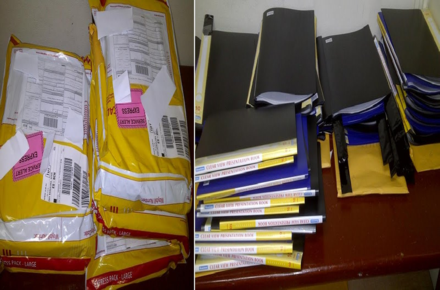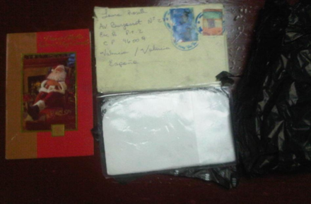 Por un lado fue ocupado un paquete tenía en su interior cinco fundas llenas de carpetas negras y éstas con sus respectivos cintillos llenos de un polvo blanco, con peso superior a los dos kilogramos, mientras el otro estaba contenido en un sobre grande con una tarjeta navideña, también rellena de cocaína. El primero envío sería realizado por una firma de correos privada y el segundo por el Instituto Postal Dominicano (Inposdom).