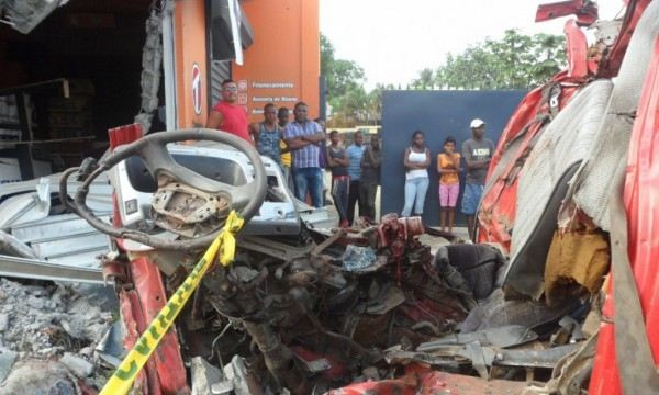 VILLA ALTAGRACIA.- Seis personas muertas es el resultado de la colisión este viernes de un camión transportador de madera contra la Ferretería Ciriaco, en el kilómetro 48, en la Autopista Duarte, en dirección norte-sur con destino a Santo Domingo.
