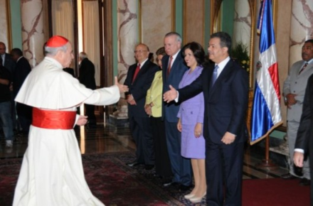 Atendiendo al protocolo de rigor, el primero en felicitar al Jefe de Estado fue su eminencia reverendísima, monseñor Nicolás de Jesús Cardenal López Rodríguez, seguido por monseñor Agripino Núñez Collado, rector de la Pontificia Universidad Católica Madre y Maestra.