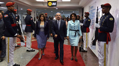 Acompañan al presidente Medina su esposa, Cándida Montilla de Medina; los ministros de la Presidencia, Gustavo Montalvo y de Relaciones Exteriores, Andrés Navarro; el asistente especial del Jefe de Estado, Carlos Pared Pérez y el jefe del Cuerpo de Seguridad Presidencial, mayor general Adán Cáceres.
