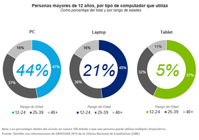 Resulta interesante ver la composición del uso por los rangos de edad. En el caso de las PC, el 47% de su uso corresponde a personas con edades entre 12 y 24 años, con un porcentaje similar de uso en las laptops. Para las tabletas ese rango aumenta a 57%. En las tres categorías, más del 80% del uso corresponde a personas de menos de 39 años.