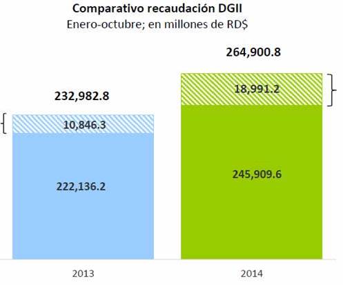 El informe de recaudación que publica el Departamento de Estudios Económicos de Impuestos Internos, revela que la recaudación acumulada durante el período enero-octubre 2014 suma RD$264,900.8 millones, para un aumento de RD$31,917.9 millones sobre lo recaudado en los mismos meses del año anterior, equivalente a una tasa de crecimiento de 13.7%. Respecto al monto presupuestado para enero-octubre 2014, se logró un nivel de cumplimiento de 98%.