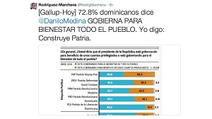 SANTO DOMINGO, RD.- El 82.8% dominicanos aprueba la gestión de @DaniloMedina. Fenómeno abarca partidos, edad, sexo, sección y región según indicó hoy la encuesta Gallup publicada por el periódico Hoy.