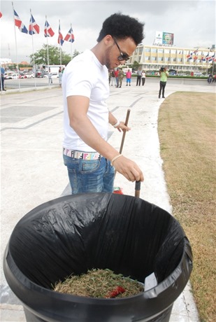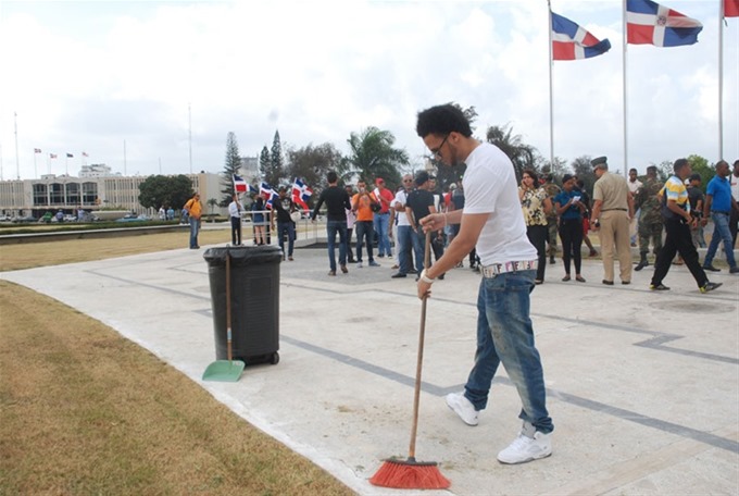 SANTO DOMINGO, RD.-Con un jean azul, tenis y camiseta blanca, y una escoba color rojo en las manos, comenzó hoy el cantante urbano Enmanuel Herrera Batista (El Alfa) a cumplir su sanción de limpiar la Plaza de la Bandera por 15 días, luego de entonar las notas del Himno Nacional.