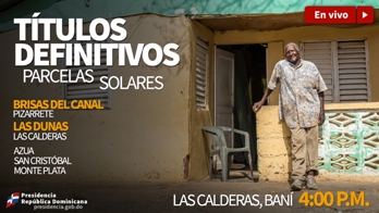 SANTO DOMINGO, RD.- La Comisión Permanente de Titulación de Terrenos del Estado y el Instituto Agrario Dominicano entregarán hoy a las cinco de la tarde títulos definitivos de parcelas y solares en la comunidad Brisas del Canal de Pizarrete, el habitacional Las Dunas de Las Calderas, en la provincia Peravia, Azua, San Cristóbal y Monte Plata. Este acto estará encabezado por el presidente Danilo Medina.