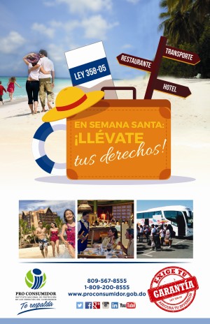 SANTO DOMINGO, RD. Con motivo de la Semana Mayor que se inicia en la cuarta semana de este mes, Pro Consumidor lanzó este lunes la campaña “En Semana Santa: ¡llévate tus derechos!”, que a través de una guía ofrece orientaciones preventivas para en este asueto en cuanto a la protección de la salud, seguridad y los intereses económicos de los consumidores y usuarios.
