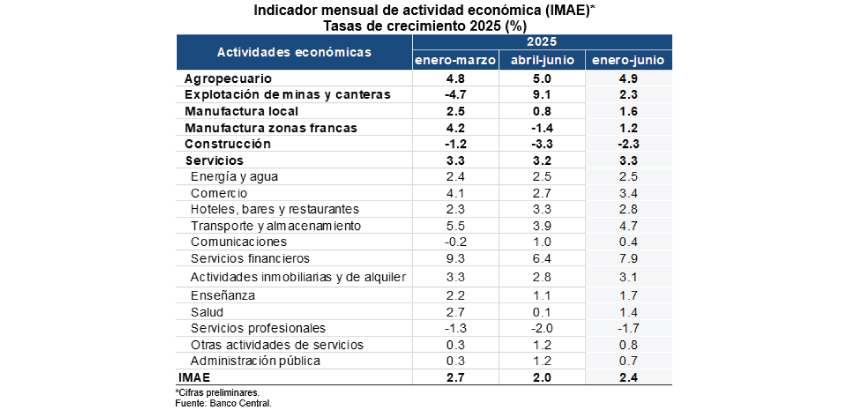 Al analizar el resultado acumulado del IMAE en enero-junio de 2025, se observan variaciones interanuales positivas en la agropecuaria, explotación de minas y canteras, manufactura local, manufactura de zonas francas, así como en el sector servicios en su conjunto. Dentro de este último, sobresalen las actividades de servicios financieros, transporte y almacenamiento, comercio y las actividades inmobiliarias y de alquiler.