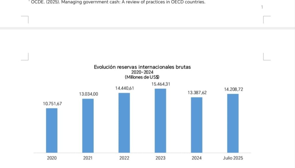 Durante los últimos años, las reservas internacionales han exhibido un notable aumento, pasando de US$10,751.7MM en 2020 a US$14,208.7MM al 31 de julio del 2025, equivalentes a alrededor de 11 % del producto interno bruto (PIB) y más de cinco meses de importación, permaneciendo por encima de las métricas tradicionales del Fondo Monetario Internacional (FMI) de 10 % del PIB y tres meses de importaciones.