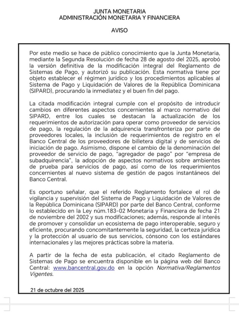 CRISTALDIGITAL.COM.DO, SANTO DOMINGO, RD.- La Junta Monetaria, mediante la Segunda Resolución de fecha 28 de agosto de 2025, aprobó la versión definitiva de la modificación integral del Reglamento de Sistemas de Pago, y autorizó su publicación.