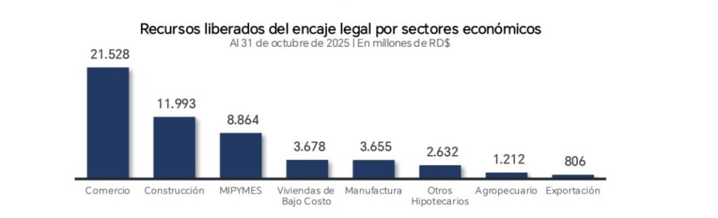 Los recursos liberados del encaje legal se destinaron a los sectores de comercio RD$21,528 millones, construcción RD$11,993 millones, Mipymes RD$8,864 millones, manufactura RD$3,655 millones, agropecuario RD$1,212 millones y exportación RD$806 millones. Dichos desembolsos incluyen RD$3,678 millones para la adquisición de viviendas de bajo costo por parte de familias de bajos recursos y RD$2,632 millones para préstamos hipotecarios en sentido general.