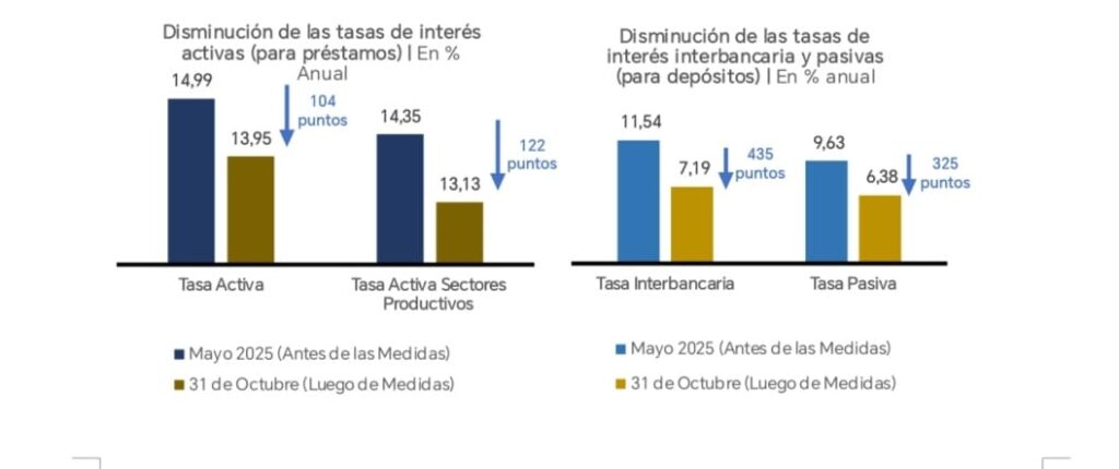 Durante el mismo período de análisis, las tasas de interés interbancarias observaron reducciones de 11.54 % en el mes de mayo a 7.19 % en octubre de 2025, completando una disminución mayor a 435 puntos básicos. De igual manera, las tasas pasivas se redujeron de 9.63 % a 6.38 % en el mismo intervalo de tiempo, para un descenso en torno a 325 puntos básicos.