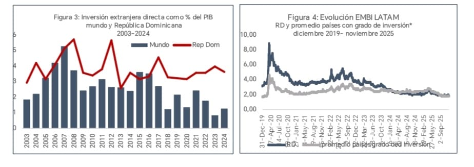 Esta perspectiva resulta relevante en un contexto global donde la fragmentación del comercio y las tensiones geopolíticas han impulsado una caída de la inversión extranjera directa (IED) mundial que pasó de 3.6 % del producto interno bruto (PIB) global en 2015 a solo 1.3 % en 2024. En contraste, la IED de RD aumentó de 3.1 % del PIB en 2015 a 3.6 % en 2024 y se proyecta en 3.7 % en 2025, reflejando la confianza de los inversionistas extranjeros en el potencial del país (figura 3).