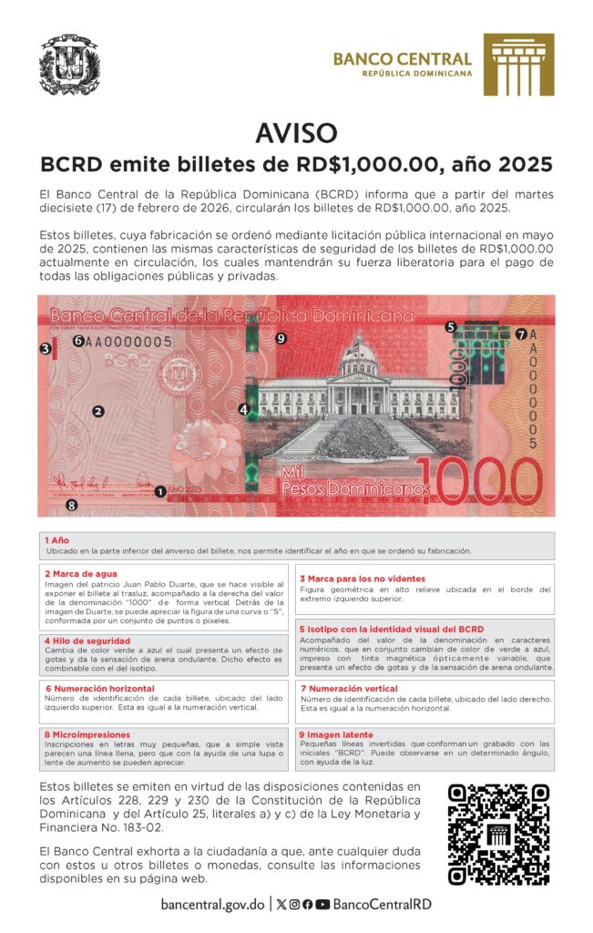 CRISTALDIGITAL.COM.DO, SANTO DOMINGO, RD.- El Banco Central de la República Dominicana (BCRD) informa que a partir de este martes 17 de febrero de 2026, circularán los billones de RD$1,000.00, año 2025.