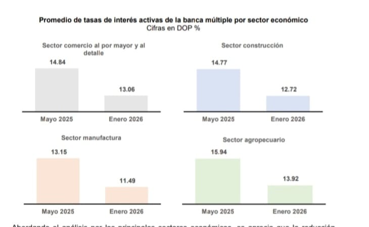 El promedio de las tasas de interés activas de la banca múltiple pasó de 14.99 % en mayo de 2025 a 13.59 % en enero de 2026, para una disminución de 140 puntos básicos, reflejando el impacto en las tasas de interés de las medidas adoptadas por la Junta Monetaria y el Banco Central de 2025