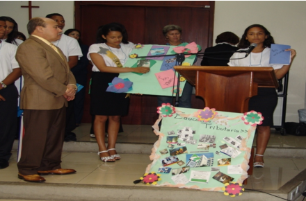 Desde el año 2006 y 2007 el departamento de Educación Tributaria trabaja con las visitas a colegios y escuelas públicas impartiendo charlas y presentaciones lúdicas educativas, donde se pudo contactar a unos 160 mil estudiante, a raíz de eso se pensó en hacer un quórum más amplio donde se detectó que el problema en la sociedad dominicana era la falta de conocimiento tributario en los jóvenes del país, con este resultado la PUCMM y el Minerd, y recientemente la Asociación de Colegios Privados, incluyeron la materia de Educación Tributaria, en los compendios de educación cívica.