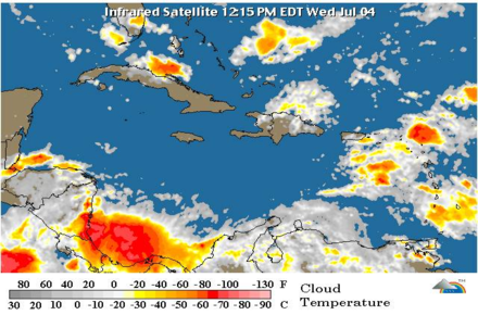 Asimismo, indica que a partir de este jueves y el viernes, se espera un incremento en la actividad nubes y aguaceros con ocasionales tormentas eléctricas y ráfagas de viento, principalmente sobre las regiones Este, Noreste, Suroeste, litoral Caribeño, Valle del Cibao y cordillera Central, debido al paso de una onda tropical, localizada al este de las Antillas Menores. Añade que esta actividad se irá extendiendo al resto del territorio a medida que la onda se desplace hacia el oeste.