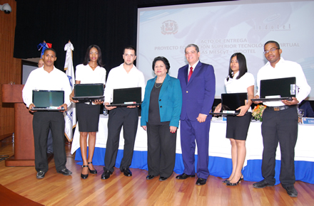 Durante la actividad se entregaron, en representación de los demás profesionales, las becas, computadoras y dispositivos de conectividad a cinco estudiantes meritorios, de diferentes universidades y con índices de 3,5; 3,8; 3,41; 3,62 y 86,9, Estos son, Alfonsina Esperanza Espinal Diloné, de Salcedo, egresada de licenciatura en administración de empresas de la Universidad Católica del Nordeste (UCNE), con un índice de 3,5; y Darwin Rafael Durán Arias, de Moca, egresado de ingeniería telemática de la Pontificia Universidad Católica Madre y Maestra (PUCMM), con un índice de 3,8.